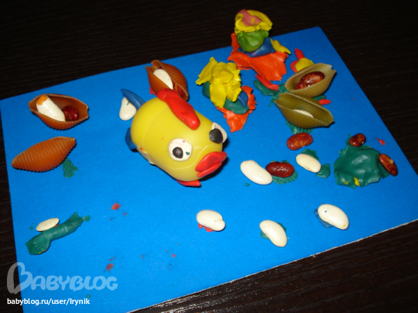 Сегодня (понедельник) у нас все очень сумбурно было. Приехало телевиденье и занятия наши все снимали (потом по ТВ покажут). Поэтому и детки отвлекались и занятия местами поменяли.Но был один большой плюс. На прикладном творчестве была другой педагог (очень она мне нравится) жаль, что не набралась группа к ней, а то бы мы туда пошли (группа для деток двухлеток, мы сейчас в группе для деток от 3-х лет). Она смогла увлечь всех, всех детей и Алина от начала до конца сделала все сама, как же я рада... И еще Педагог сказала, что в основе наших занятий не красота готовой работы, а основная направленность на то, что бы побудить у ребенка желание заниматься творчеством. Вот ей сегодня удалось это на все 10 баллов, прийдя домой Алина попросила пластилин и лепила у себя в комнате целый час!!!  Делали сегодня рыбку вот такую. В основе яйцо от киндер-сюрприза. В качестве ракушек- макарошки "ракушки", камушки- это фасоль.