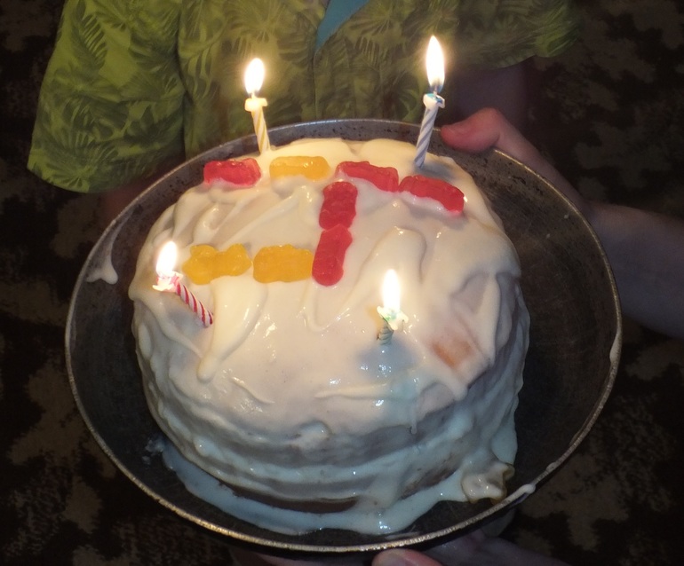 Торт есть, свечки есть, ребёнок рад. И не важно, что торт подан на старой сковородке)))))