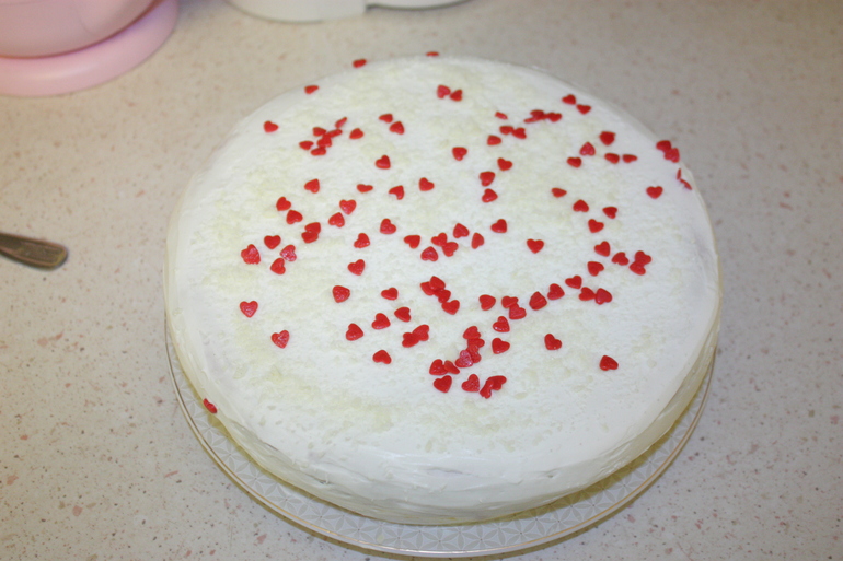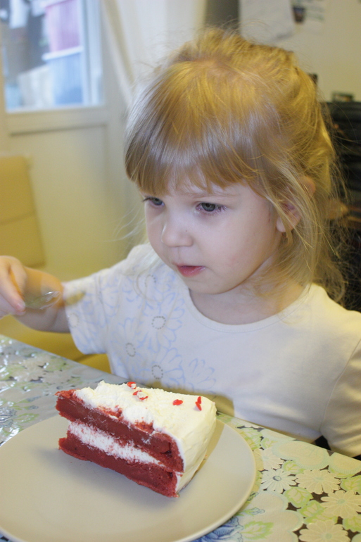 на сам день Рождения я смастерила вот такой сытнющий торт Красный бархат (на фото видно какой он красный и сытный))