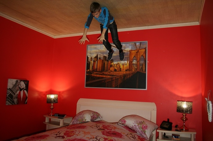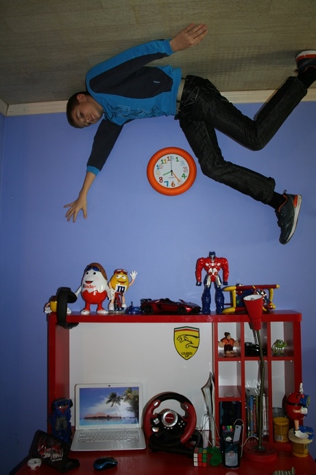 Большой стол и стул, кухонная мебель, кресло и мягкая игрушка, банка сгущенки и торт. Получаются смешные фотографии.