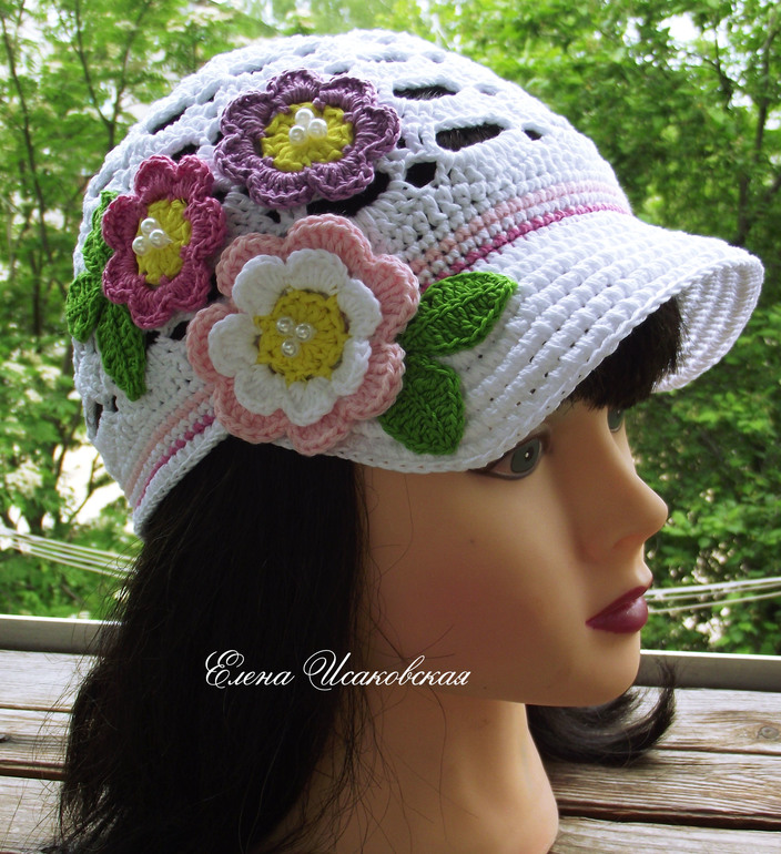 Пряжа для кепки Пехорка Успешная в 2 сложения, для украшения разные остатки. Крючок Кловер 2,25. У шляпки Вита Розе, крючок 2,25.