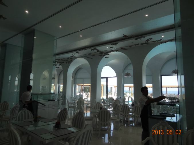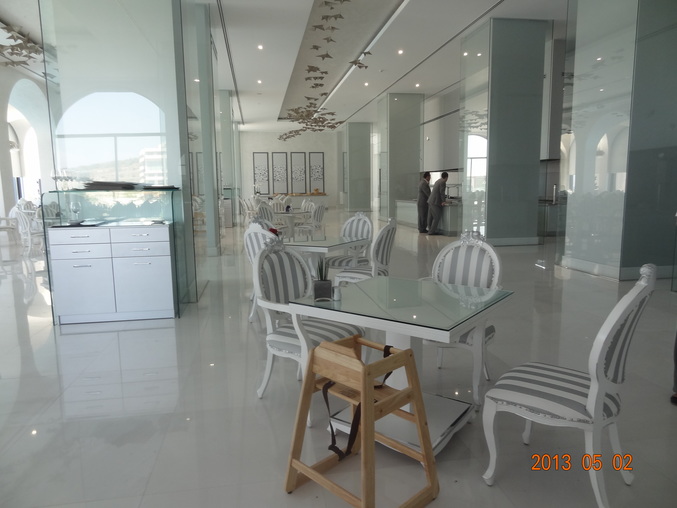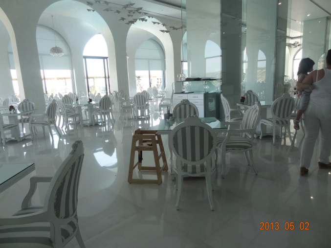 Ресторан (основной) тоже с белыми столами и стульями обтянутыми светлой тканью, хе хе:) Поспрашивав туристов за еду, сделала отметку, что харчуют там неплохо:) Пюрех для млышей нет! Так что готовьте в сумках место для блендера:) Диет стол с вареными овощами, разумеется присутсвует...