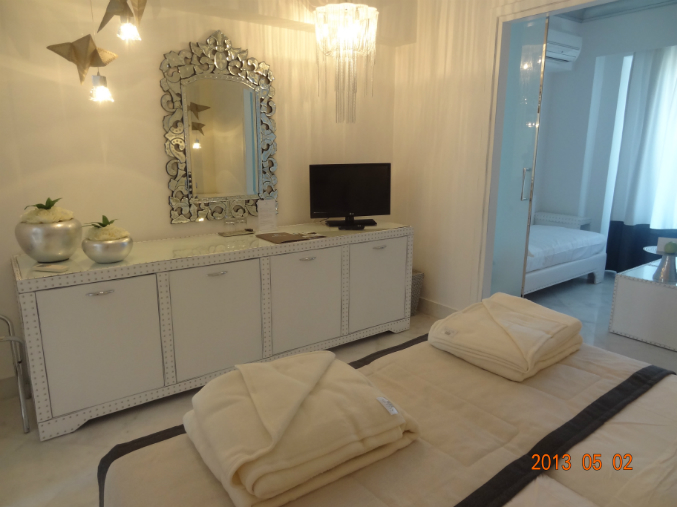 Все номера одного размера, расчитаные на 4 спальных места. 2 кровати обычные или сдвинутые или нет ( в греции с кинг сайзом вообще напряг) и 2 бЭлЫх - бЭлЫх дивана, опять же на радость нашим шилопопам с фломастерами в руках и песком в сандлях:)