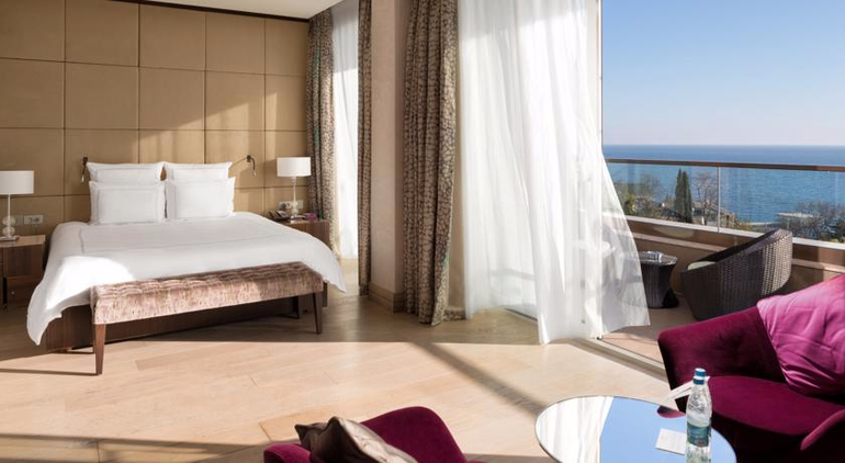 Стандартные номера категории "Премиум" расположены на последних этажах отеля. Они были созданы для тех, кто предпочитает дополнительное пространство и великолепный вид на море. Элегантная гостиная зона послужит прекрасным местом для встреч и большой рабочий стол у окна особенно подойдет для тех, кто находится в Сочи по делам, а удобная ванная поможет вам расслабиться и отдохнуть.