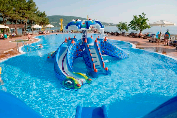 Задорно поплавать, скатиться с яркой горки, поплескаться в брызгах искусственного фонтанчика приглашает маленьких постояльцев полномасштабное отделение во взрослом бассейне. Это увлекательная зона для водных игр, с небольшой глубиной, лежаками для взрослых по периметру. Наполнен бассейн чистейшей водой. На территории бассейна работает кафе, где можно угостить своего проголодавшегося малыша вкусным десертом.