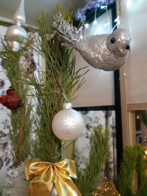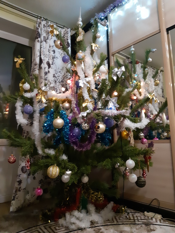 Можно было, конечно, проинструктировать, что крупные вниз, а маленькие повыше... Ну и мишуру распределись по ветвям изящней... Но это же можно тихонечко поправить, пока спят...