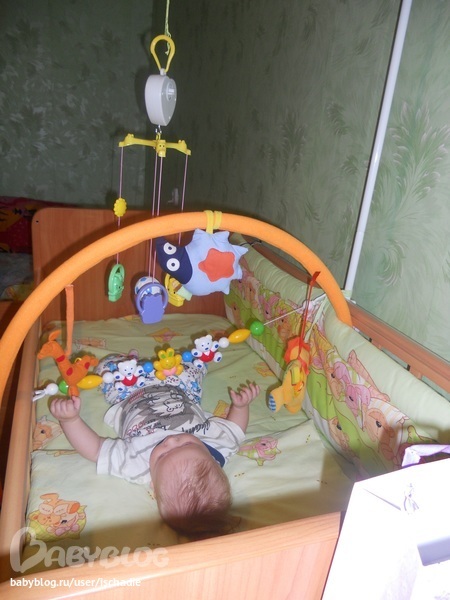 Саша доче еще дугу от коврика к кроватке приделал, т к она любит жирафика)) теперь у ребенка все удовольствия)) и мишки, и жирафик и кисаньки песенки поют)))