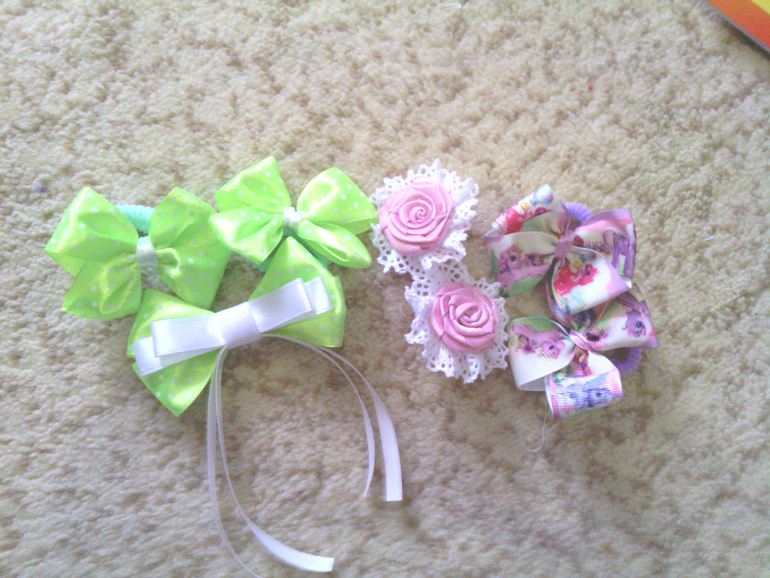 вот такие чудесные бантики для доченьки)) салатовый комплектик с брошечкой)) Завтра бантики обновим в садик))
