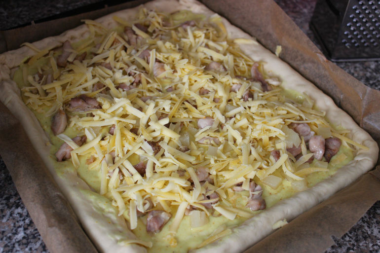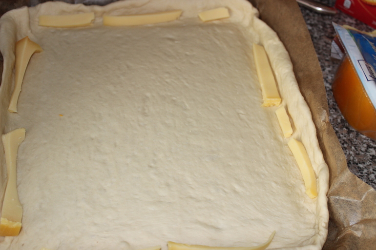 Раскатываем тесто, здесь уже кому как нравится, мы любим потолще, по бокам я укладываю сыр и залепляю.