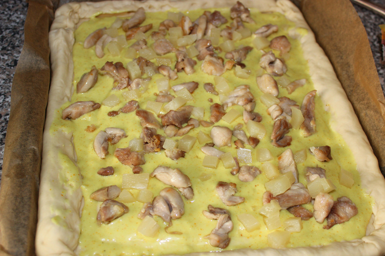 Выкладываем соус, порезанные ананасы, курицу и посыпаем сыром.