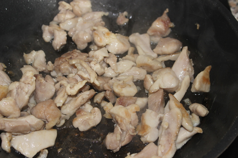 Курное филе обжариваем минут 8, солим, немного перчим и ставим остывать.