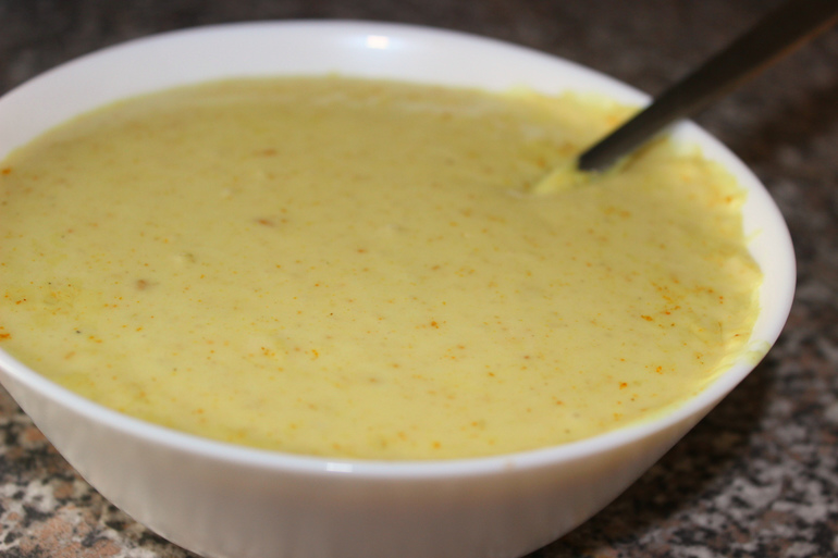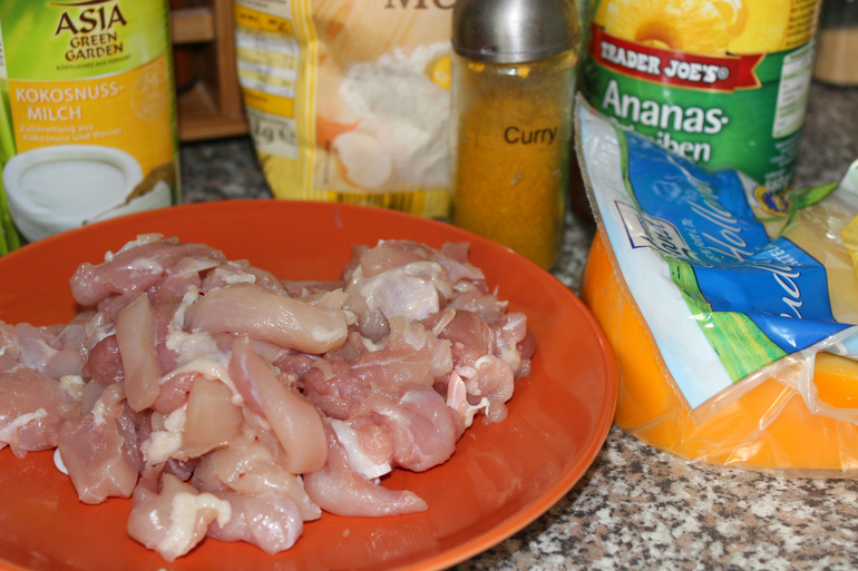 смешиваем муку, кокосовое молоко, ананасовый сок и варим минут 8 на среднем огне, солим, перчим, добавляем сухую приправу карри, я добавляю 3 ч. л, но у всех вкусы разные, так, что лучше регулировать по вкусу. Снимаем с огня и даём немного остыть.