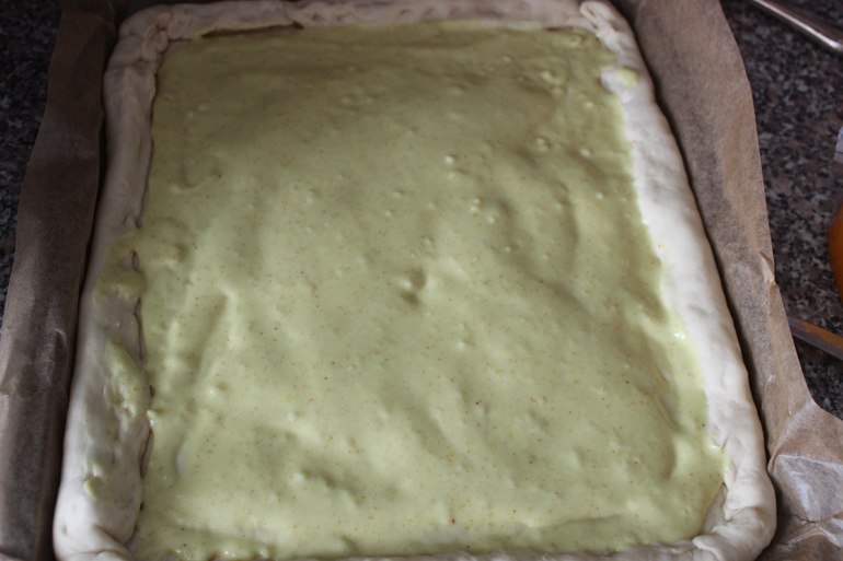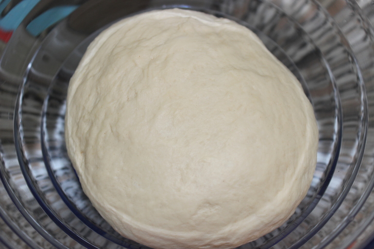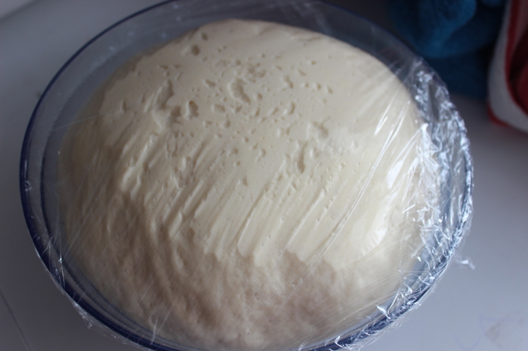 Нагреваем духовку до 180 градусов, выключаем, накрываем чашу с тестом пищевой плёнкой, закутываем в полотенце и ставим в духовку на 25-30 минут. Тесто готово