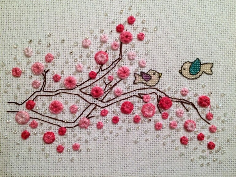 Я вообще вышивкой не сильно увлекаюсь, но иногда бывает....накатывает... В последний день зимы увидела чудесную вышивку, где совмещена вышивка крестиком, бэк ( по моему так называется), объемная вышивка еще и бисер. и в первый день весны работа уже готова.!