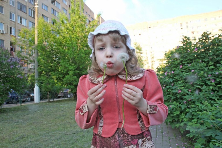 Лето у Лизы ассоциируется с солнцем и одуванчиками. Она их очень любит. Каждый год мы встречаем лето с одуванчиками.