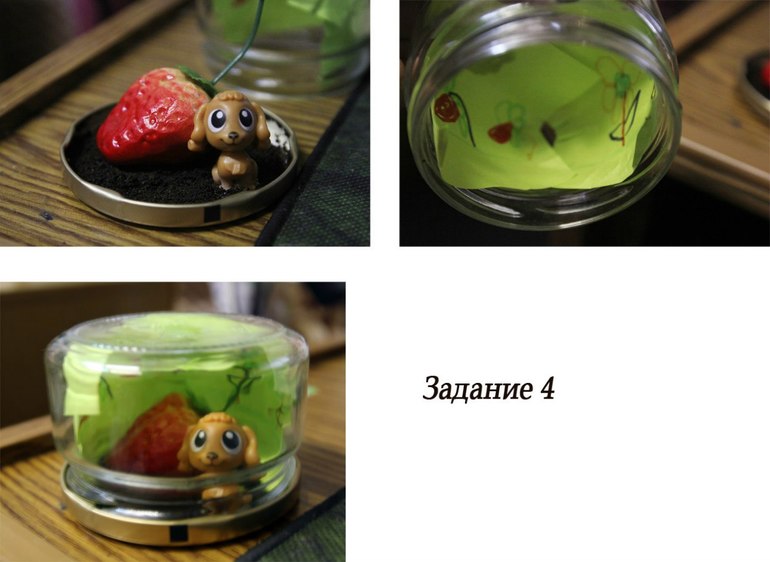 Сначала мы налили на крышку клей и Лиза рассыпала на верх чай, потом приклеили собаку и клубничку. Потом Лиза нарисовала фон на листочках (цветы и клубника). Приклеили листочки к банке. Закрыли банку. Название композиции: Сторож)