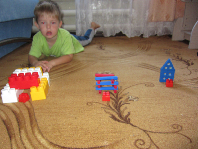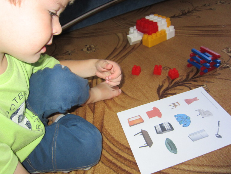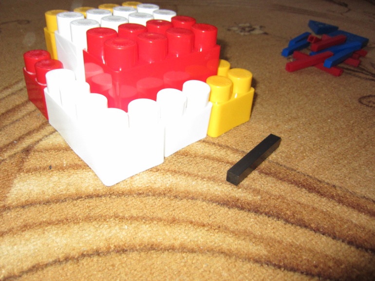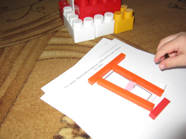 Построили поросятам домики, по ходу дела обсуждали, что нужно для строительства. Максим сказал - кирпичи и инструменты. Представили ситуацию, что у строителя пропал молоток. Чем же его можно заменить? Ребенок сказал, что кирпичом или большой палкой.