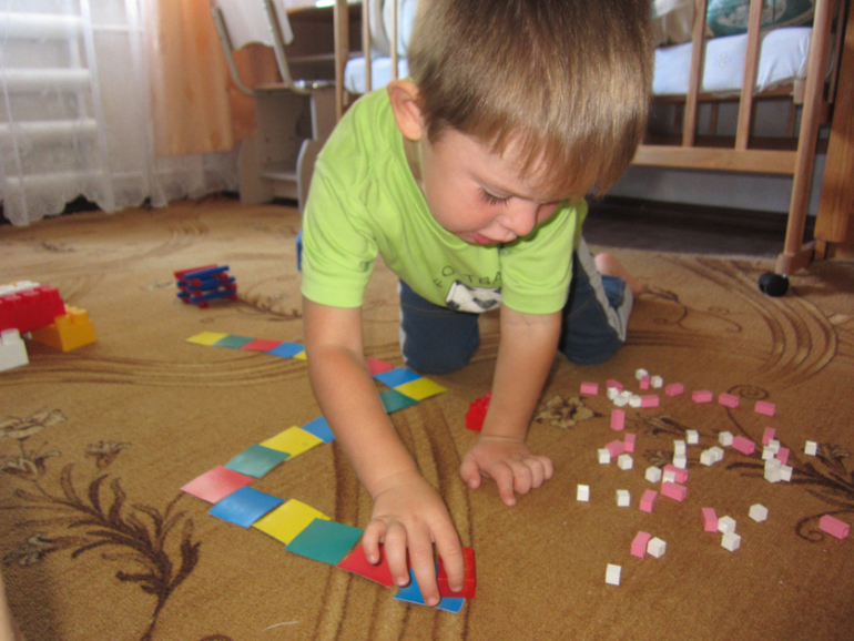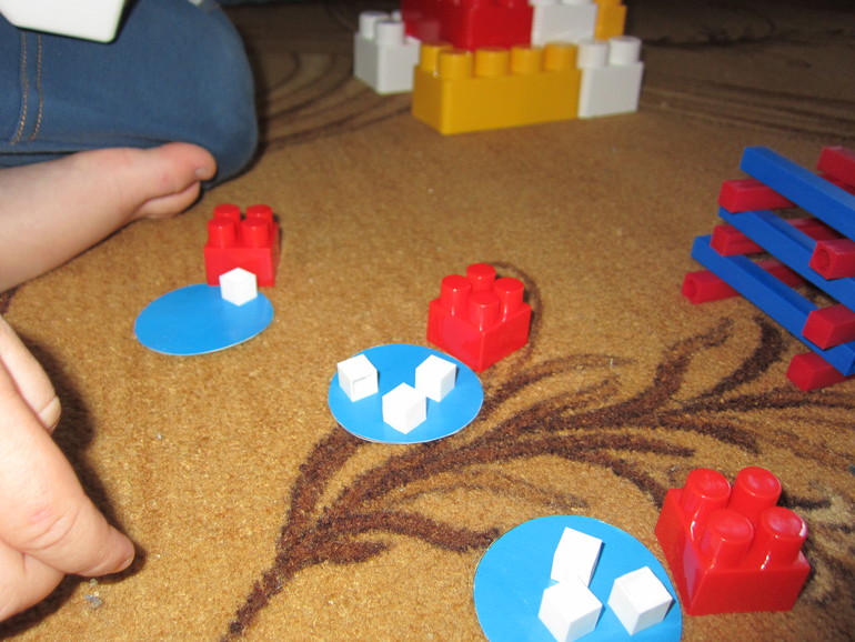 После стройки поросята проголодались и решили отправиться в лес за желудями. Но сначала нужно им проложить дорожку до леса. Выкладывали последовательность цветов. Потом собирали желуди (палочки Кюизенера белого цвета, а розовые у нас были мухоморы)))