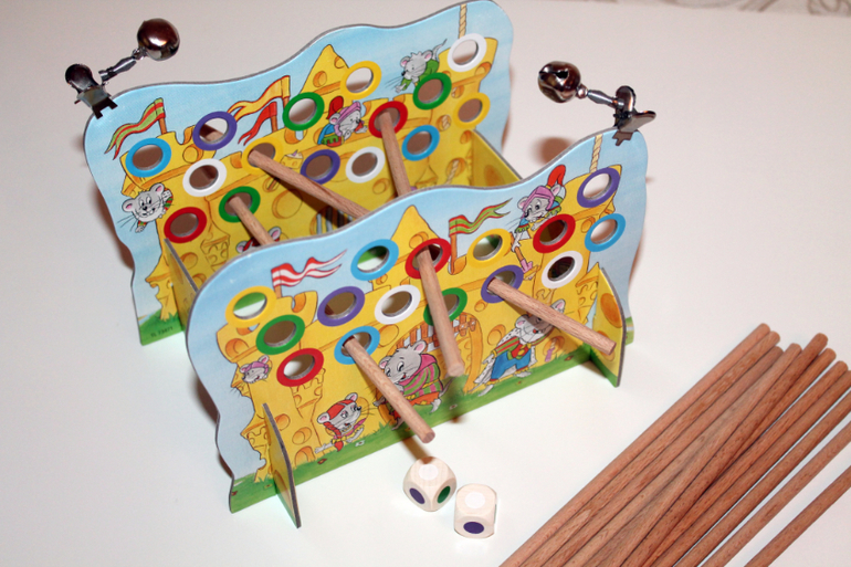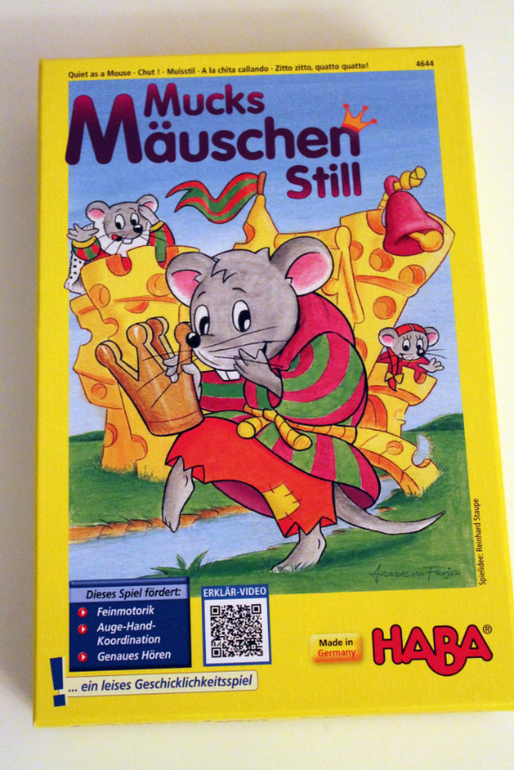 Тихо как мыши (haba) - игра на ловкость. Броском кубика определяем цвета отверстий, куда предстоит продеть палочку. В итоге получается целая паутина! Но не все так просто: от наших действий не должны зазвенет колокольчики в верхней части конструкции. Игра подойдет и для малышей! Даже Софи у нас вполне справляется с правилами).