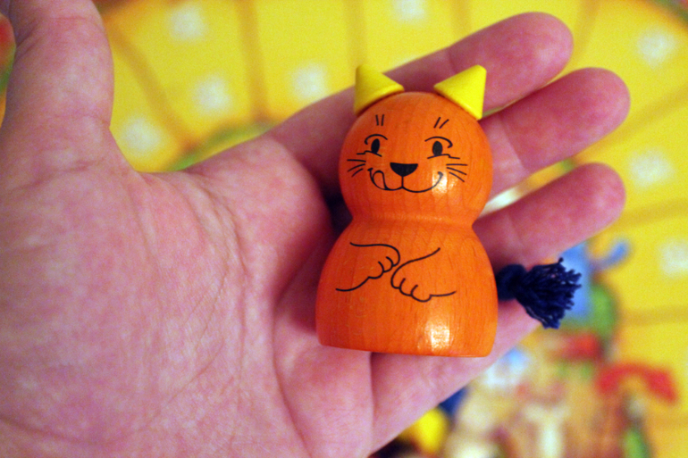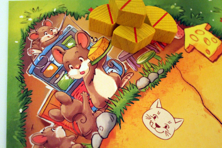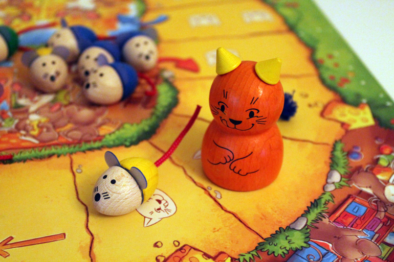 Да здравствуют мыши! (Pegasus) - очень милая ходилка для малышей! Сами персонажи крупные, деревянные, приятно в руках держать! Тема "кошки-мышки" 🐱🐭 обыграна уже во многих настольных играх, но здесь хороша, как нигде! Итак, наша задача - собрать как можно больше сыра и при этом не попасться в лапы коту. В углах поля расположены сырные кладовочки. Там-то и спрятаны лакомства - от 1/4 до 3/4 головки сыра, а целые хранятся в центре поля. Но не забывайте, что раз уж мышь попала туда, то из игры выбывает (хотя приносит игроку сыр)! В целом, игра подразумевает выработку стратегии - отправить мышь за сыром в первую попавшуюся кладовочку или бежать дальше в надежде ухватить кусок побольше. Но у нас пока всё предельно просто: "Могу получить сыр тут, значит, надо брать!" 😂 Но вы бы видели сколько эмоций вызывает эта гонка - дети визжат от восторга, когда кот подбирается ближе))))).