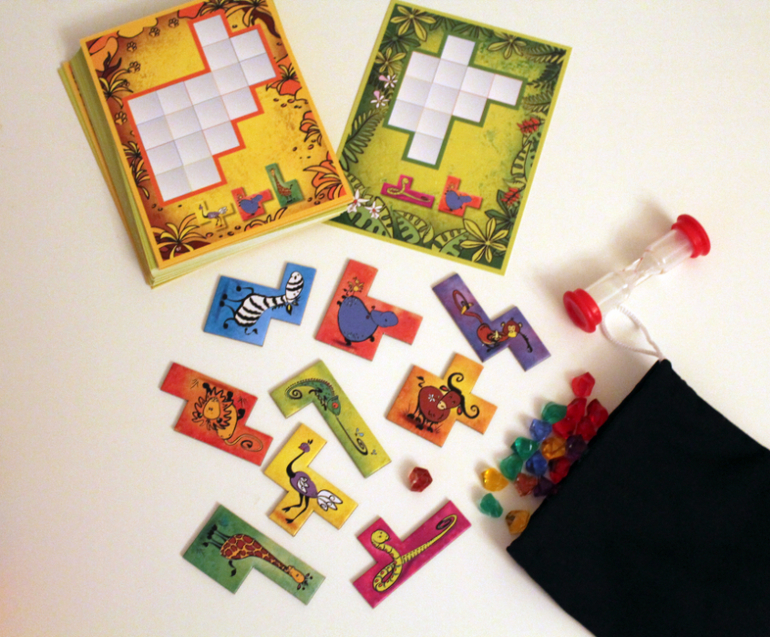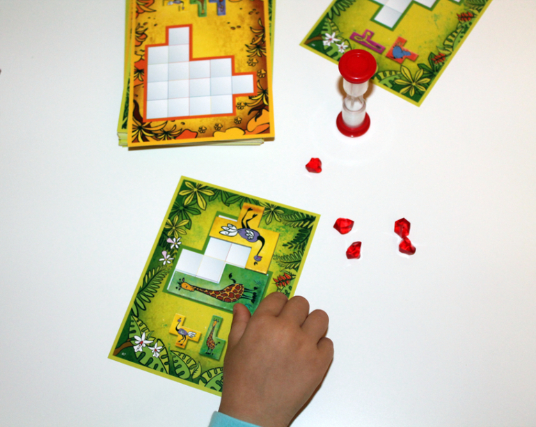Ubongo junior (Kosmos)- отличная игра для развития пространственного мышления! Принцип тот же, что и в Катамино. Но эта игра, конечно, попроще). Карточек 2 варианта: с расстановкой 2 или 3 животных. Качество исполнения понравилось - зверюшки симпатичные, камушки сразу зацепили внимание (очень желанное вознаграждение оказалось))). А вот возраст завысили! Ну не на "5+" точно! Микаэл уже вполне соревнуется на скорость с нами, родителями). Софи справляется медленнее, но сложить фигурки в задании для неё уже совсем не проблема ;)