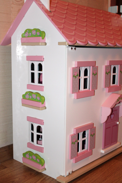 , конечно) я хочу именно такой. Наш домик шел без мебели (есть у Le toy van серия домиков поменьше, но с базовым комплектом мебели). Сам домик выбирала с боковыми окошками, т. к. без них внутри было бы темновато. До покупки "живьем" посмотреть возможности не было, но качество оказалось просто замечательным! Домик полностью деревянный, собирается очень легко (у мужа ушло минут 25), никаких сколов или непрокрасов не обнаружилось (кстати, вся краска нанесена непосредственно на дерево, можно спокойно протирать при необходимости), отшлифованы детали и мебель отлично - приятно в руках держать). Что касается реакции Софи, то это была любовь с первого взгляда, не отрывалась от него все утро (вместе с братиком)