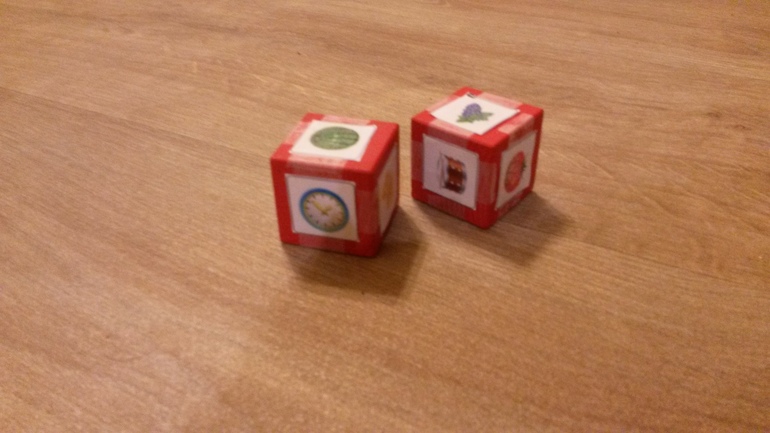Все думала купить такие кубики. Но цена за 2 кубика как-то дороговата (в Лабиринте 330 руб). Пришла идея сделать такую игру на обычных деревянных кубиках. Мне понадобилось: 2 кубика, скотч, распечатанные картинки (взяты из Лабиринта). Жду дочь из сада, потестим сегодня )))