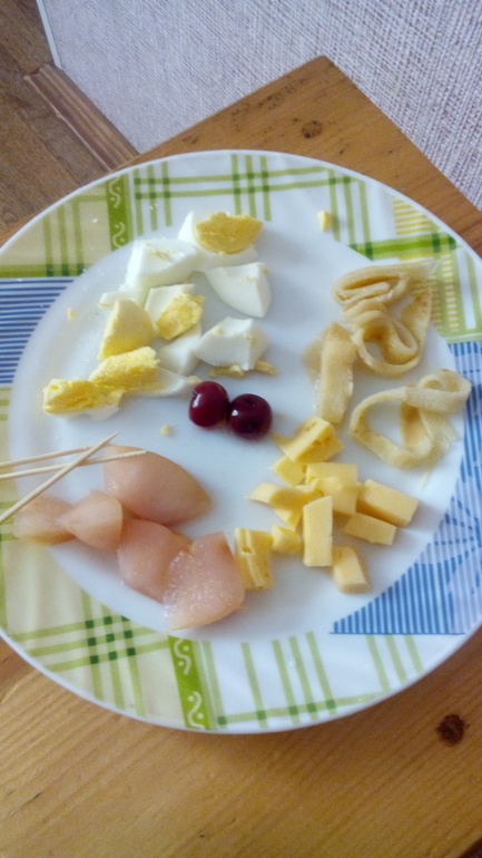 Только такие кусочки. Если накалывать на зубочистки, вообще быстро съедается. А если ещё вокруг тарелки посадить мелкие игрушки, в компании такой весело завтракать очень!