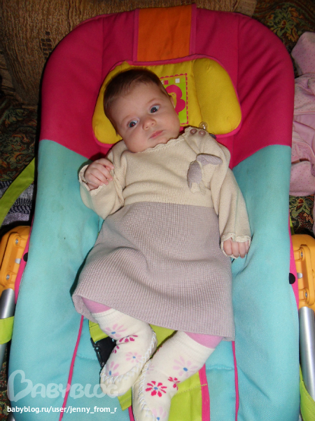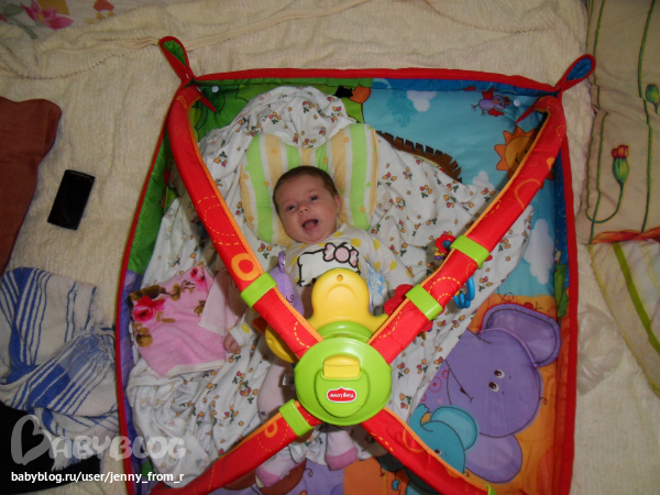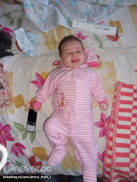 Ужасно любит лежать голопопить, даже несмотря на быстро появляющуюся икоту, ее все равно это приводит в восторг, лежит "агукает", повторяет за мной и за бабушкой(сразу поясню папа у нас в москве), смеется во весь свой беззубый рот. кстати уже неделю как начала активно слюни пускать и кулак свой сосать, прочитала тут, по-видимому, "зубастые дела" .