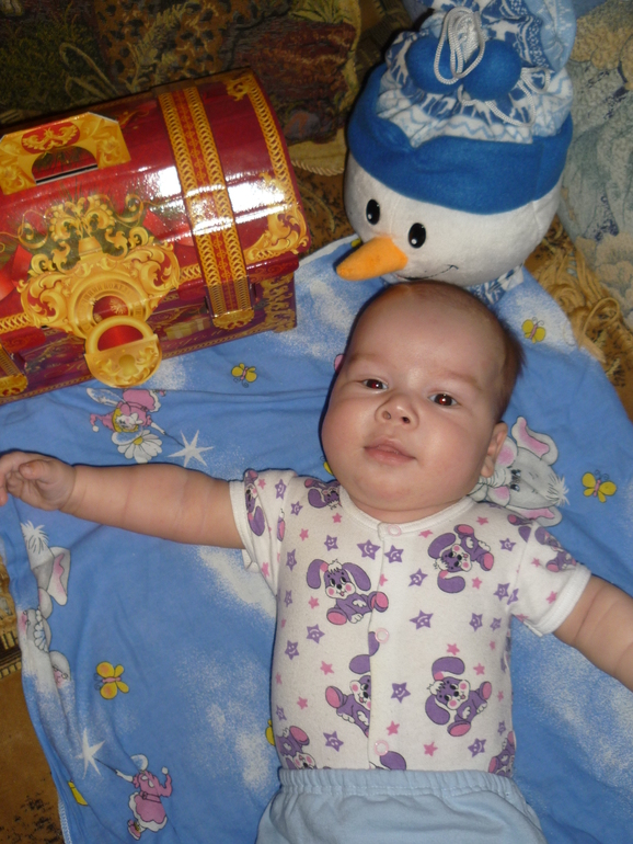 а что может вообще достаться ребенку оттуда до 3-4 лет?!?нам пока не выдали. в том году были у мужа - картонный "Теремок", а у меня - набивной (конфетами) плюшевый заяц. Зайцем играем, в младенчестве глубоком вообще его любила - хохотала.