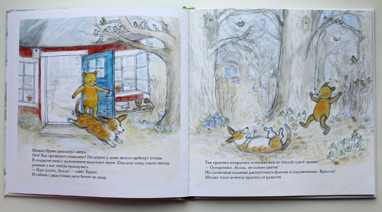 Сама книга написана простым повествовательным языком. Два героя - Мишка Бруно и его собака Лолли. Они идут в лес и повсюду замечают признаки наступающей весны, встречают первые зеленые ростки, пробивающиеся из земли, находят муравейник в лесу, запускают палочки в ручейке.