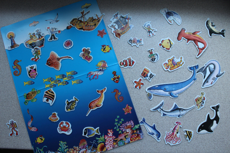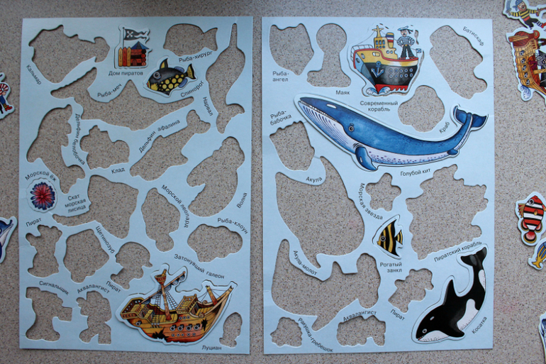 Куча картонных морских обитателей, моряков и пр. на магнитиках. У нас все это добро на холодильнике живет, т.к. поля маловато )