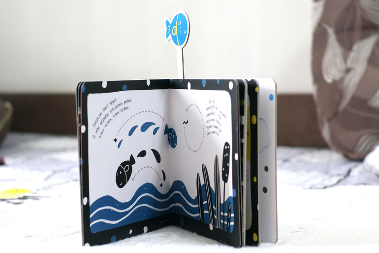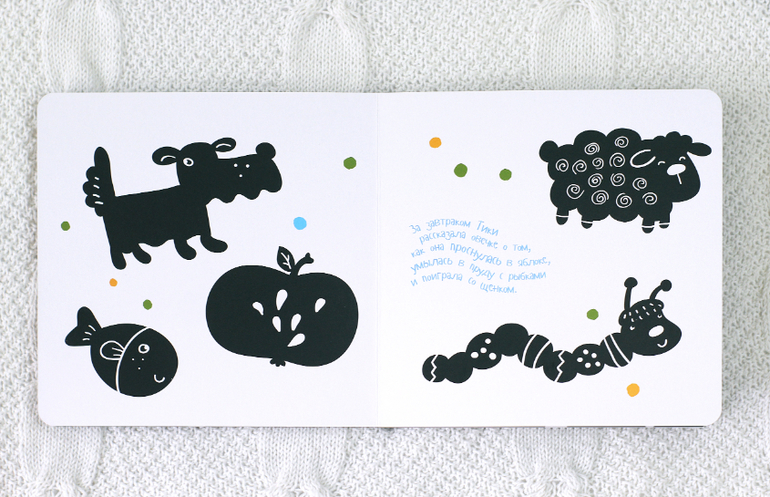 Первое, что меня подкупила цветовая гамма. На каждом развороте присутствуют черный и белый цвета и еще 1 или 2 контрастных - такое цветовое сочетание привлекает внимание малыша и стимулирует зрение.