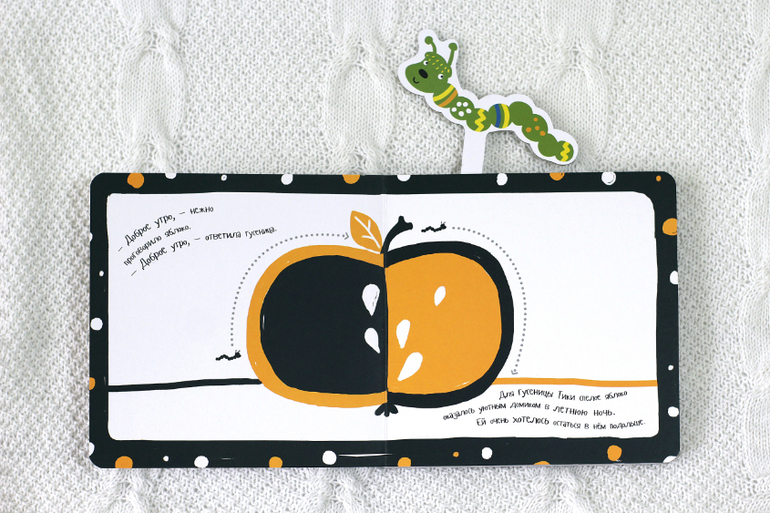 История в книге про гусеничку-путешественницу. Нет-нет, ничего общего с знаменитой обжорой Эрика Карла нет. Наша малышка ничего не ест, она ползет и на пути встречает рыбку, щенка, который задорно лает "гав-гав" и овечку, которая здоровается "бе-бе-бе".