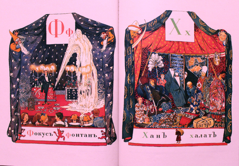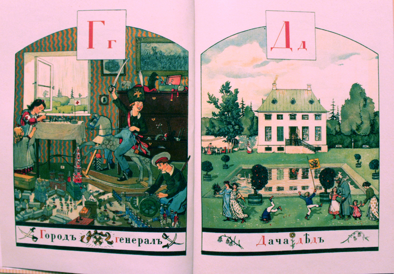 А для любителей винтажа покажу пару разворотов Азбуки с картинами Александра Бенуа.