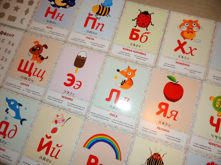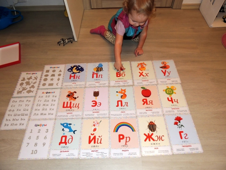 Умный алфавит неубиваемые карточками из толстенного картона с милейшими картинками и простенькими стихами, а в довесок набор трафаретов. Варя очень их любит!
