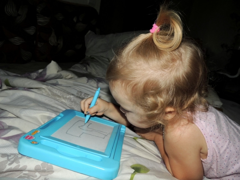 Первые попытки написания букв мы предпринимаем на планшете, я рисую как бы оболочку буквы, а Варя заполняет "внутренность" и получается буква.