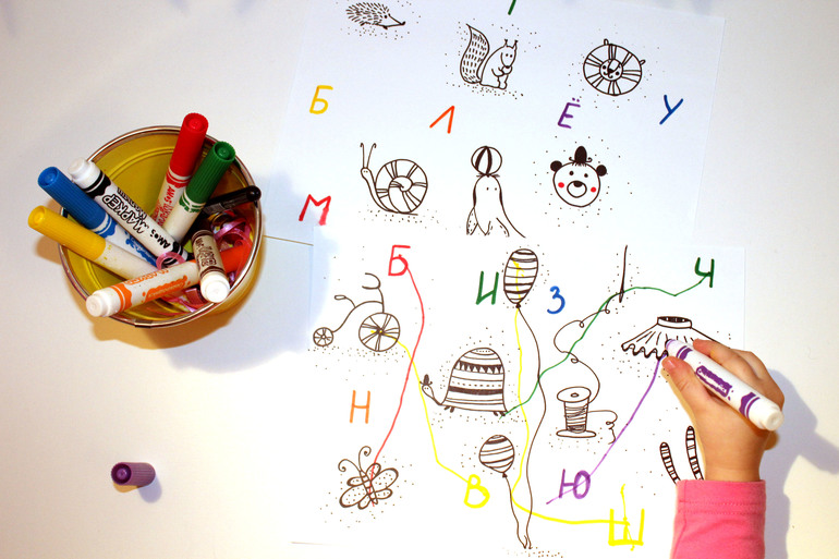 Я очень часто рисую Варе разные проводилки. Она это дело полюбила всей душой. Поэтому и буквенные проводилки тоже имеются: