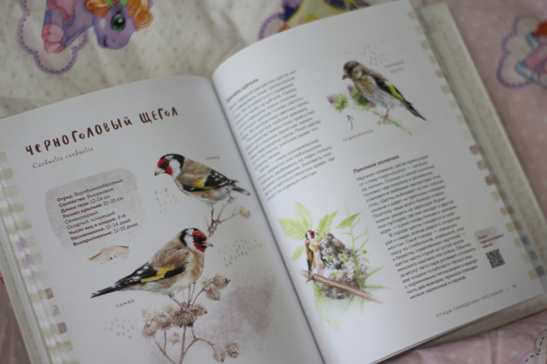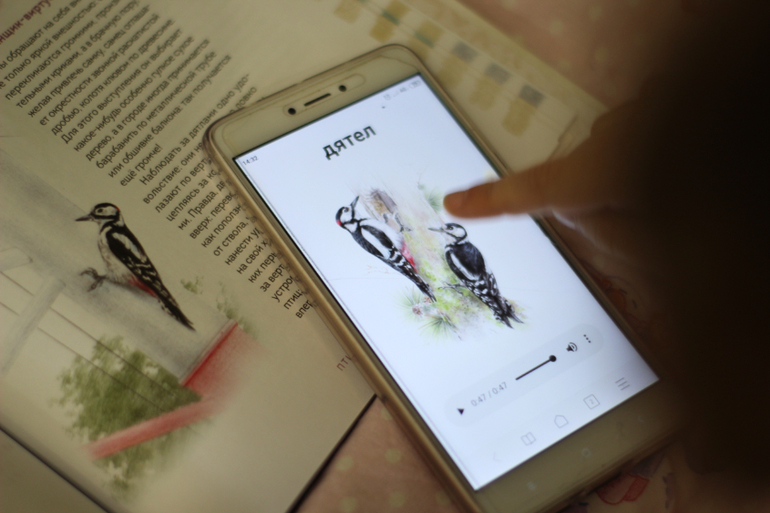 На каждом развороте с видами птиц внизу расположен QRкод, который можно считать с помощью приложением на смартфоне, и перейти на страницу с голосом той самой птички и прослушать его.