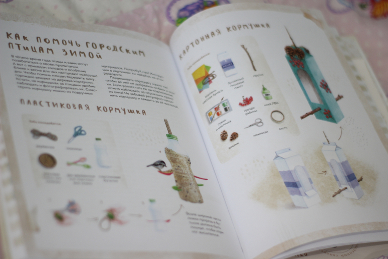 Пара разворотов посвящена тому, как помочь птицам зимой, как сделать кормушку, чем можно кормить, чтобы не навредить птицам.