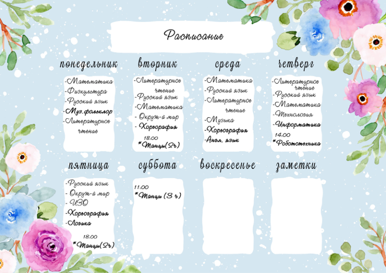 Жирным школьные допы, под звездочкой наши внешкольные. Итого в школе ко всем предметам плюсом: информатика, муз. фольклор, хореография, английский язык, логика - иного всего, но у нас класс творческий поэтому так. Танцы у нас остались, теперь правда аж 7 часов в неделю, пока тянем, и Варя мечтала о робототехнике, ходит раз в неделю, обожает)