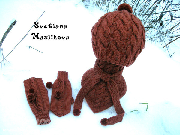 . Ну и получился у меня вот такой комплектик сестрёнке в подарок, пряжа Вита Сапфир, ушло почти 400г, шапку вязала в две нити, схем и описания нет, шапку вязала по фото с интернета, а варежки и бактус придумались потом к шапке, приятного просмотра.