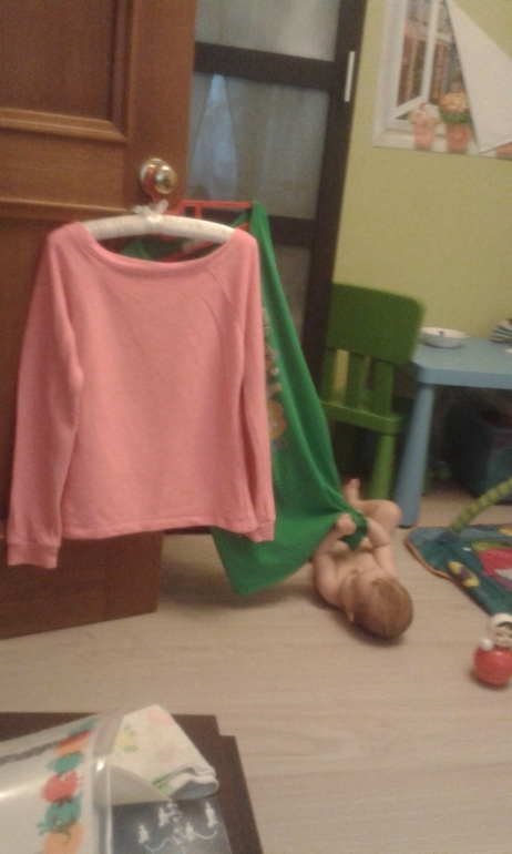 ну и фото:подползает к висящим моим кофтам на глажку и пытается их на себя стащить