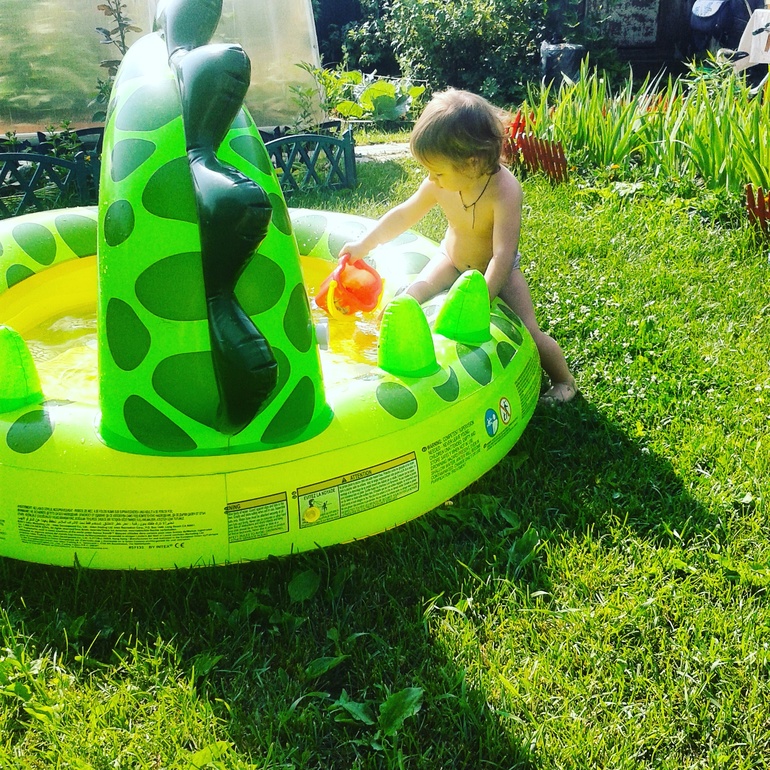 Я любовалась детскими бассейнами-комплексами с горкой, но поняла, что с пузом не управлюсь за таким следить, наполнять-сливать, мыть... Может, на будущий год. А пока чуть больше метра диаметром взяли и довольна.