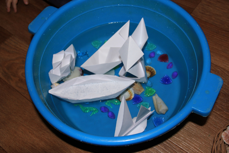 Ну и заключительным и самым интересным - это была игра в море. Ее не оттащить было)) Нам наш папа сделал целый флот из корабликов. Мы сначала запустили наших рыбок, дельфинчиков и морских коньков, ну и конечно ракушки и звезда была морская)))