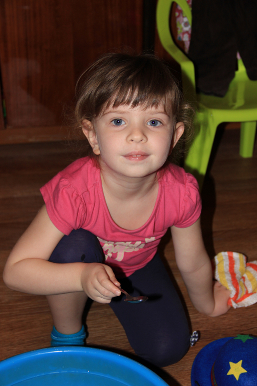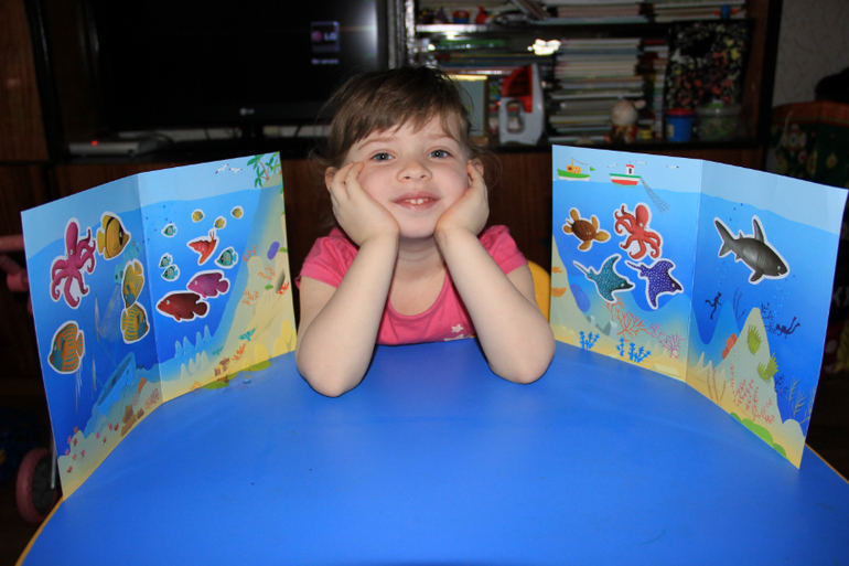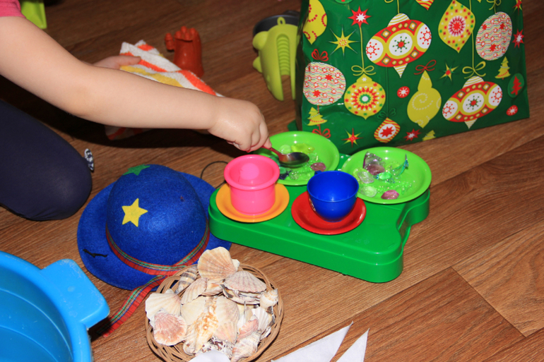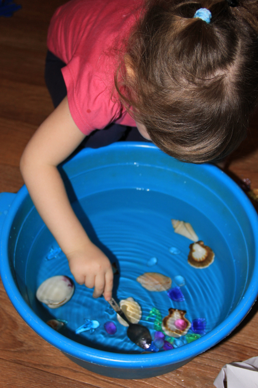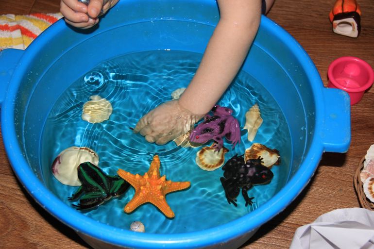Потом Ксеня сама стала придумывать ход игры. Сначала она принесла ложку и стала ей вылавливать всех наших морских обитателей.