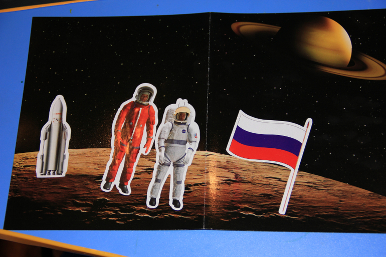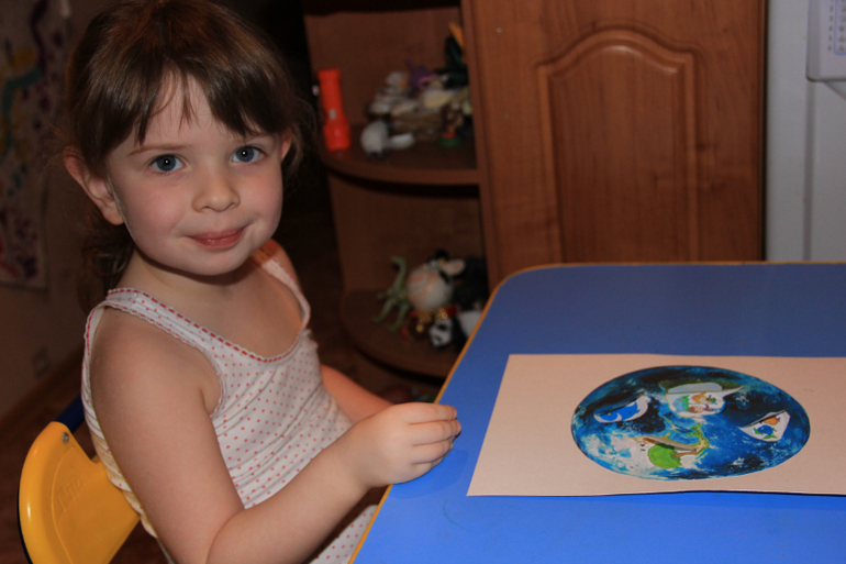 Потом мы с Ксеней поговорили, что такое космос. Сделали свою солнечную планету с помощью наклеек. Приземлился космонавт на Марс у нас.