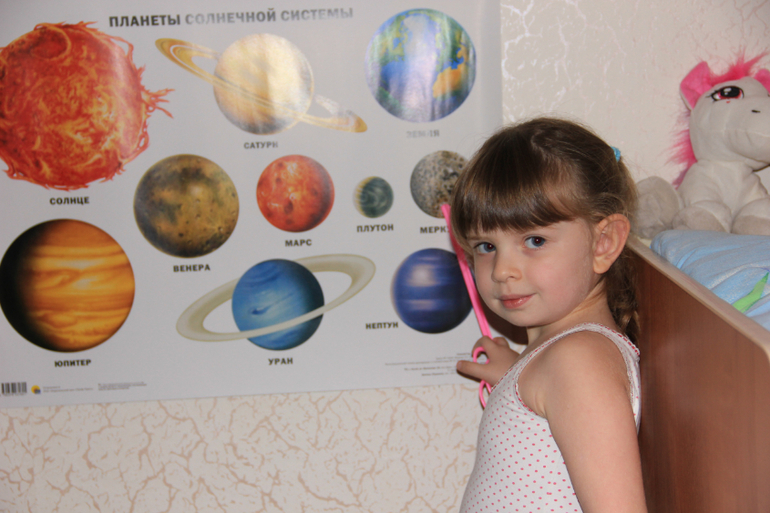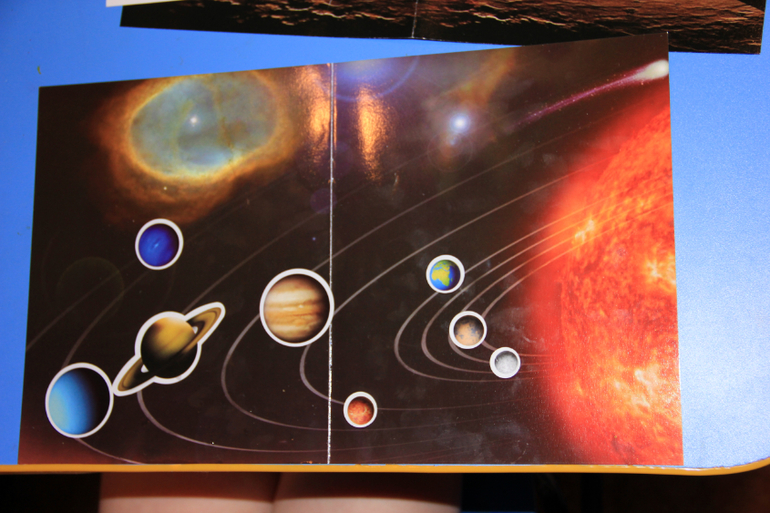 Также мы изучали книгу с картами и солнечную систему. Плакат с планетами для Ксю просто была находка. Ей не хватило их просто просмотреть и найти отличия, она стала играть в школу :-) Вышла к этому плакаты взяла указку (если можно сказать, что это указка) и начала спрашивать сначала меня, а потом все свои игрушки усадила их и опрос начала у них :-)