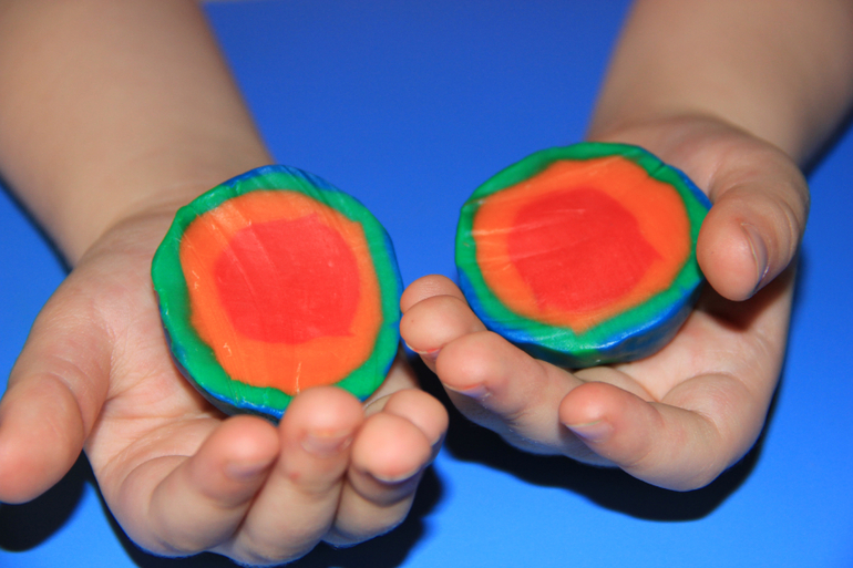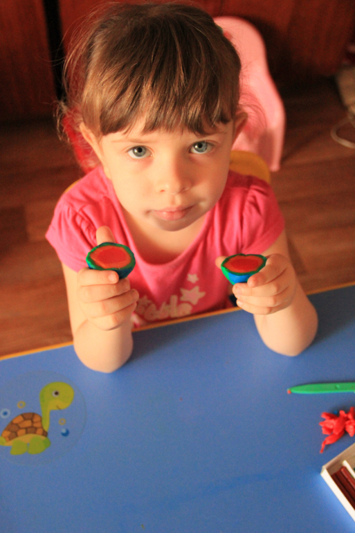 В этот день мы делали землю из пластилина. Ксю была от нее в восторге. Когда мы ее разрезали и я показала где самый горячий слой. Дак она с таким восторгом дотрагивалась до нее и отдергивала ручку со смехом говорила: ой горячо.)))