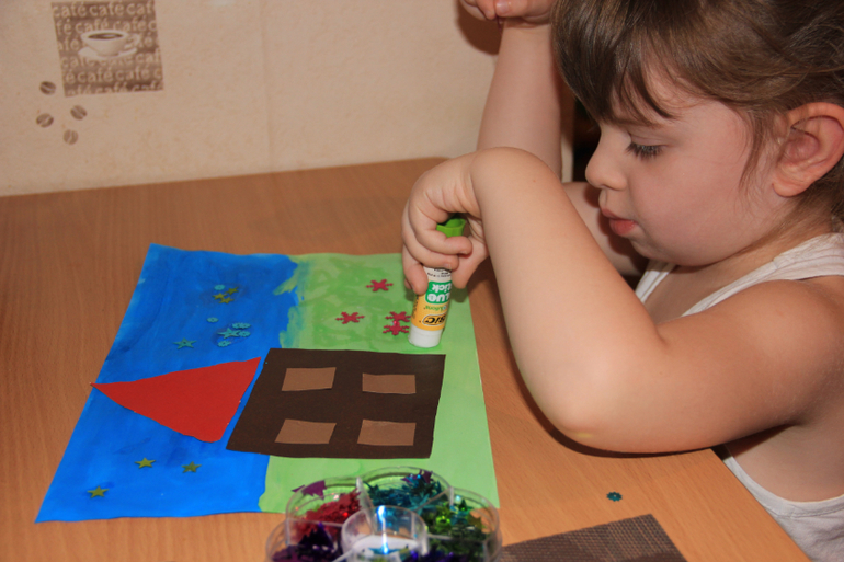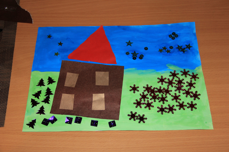 Нарисовали небо и травку, а пока сохла наша заготовка мы вырезали крышу треугольник и квадрат и маленькие окошки. Сделали аппликацию дома. Я хотела предложить сделать облака из ваты, как советовала Оксана, но Ксю решила по-другому :-) Она сказала, что у нас будет ночь на этой картинке. Приклеила звёздочки, елочки (т.к. скоро зима), а мы все спим в этом доме, вот нас и не видно. Меня прям порадовало ее воображение :-)
